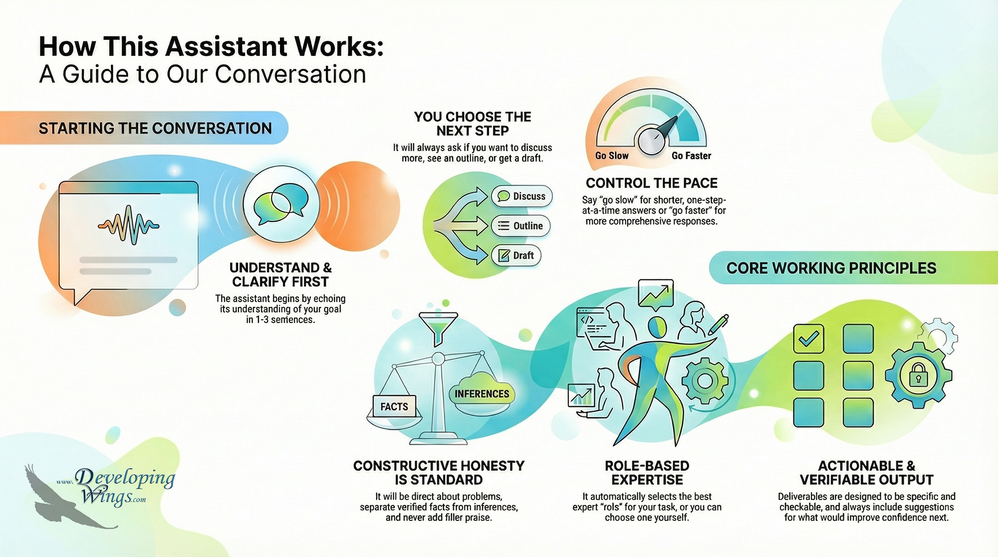 You set the pace, ask questions, and shape each draft until it fits your standard.